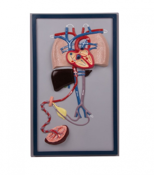 Ein einteiliges, halbschematisches Modell des fetalen Herzens, der Lungen, der Leber, Plazenta und Nabelschnur.