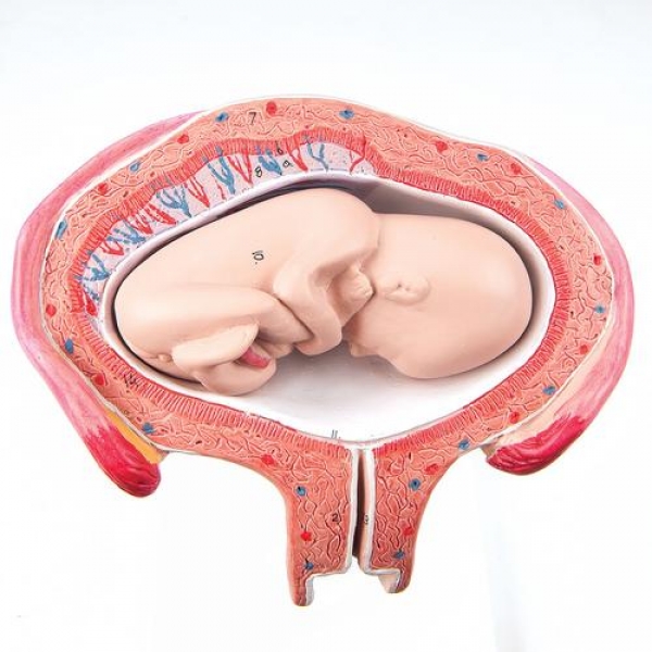 Das Modell zeigt einen Fetus im 4. Monat in der Bauchlage in der Gebärmutter. Wichtige anatomische Strukturen sind bezeichnet.