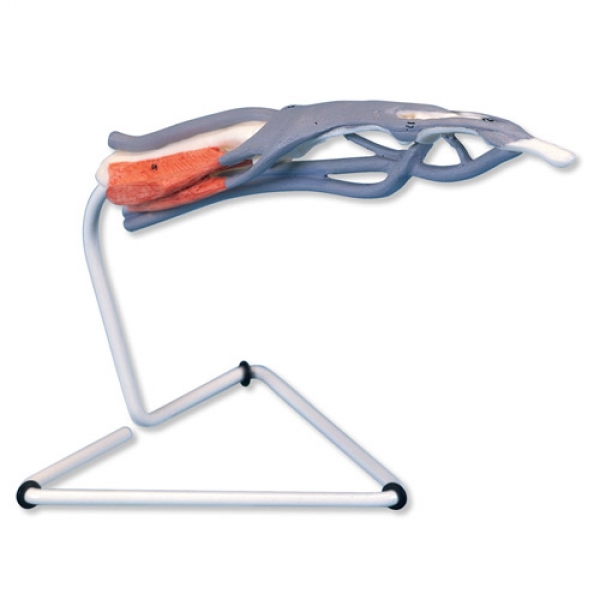Ein detailgetreues Modell des menschlichen Mittelfingers zum Studium der Knochen, Muskeln und Sehnen. Auf Stativ.