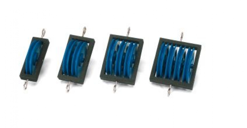 Verformungsresistente, reibungsarm gelagerte Rollen mit Schnurrillen und Haken an beiden Enden zum Auf- und Anhängen.