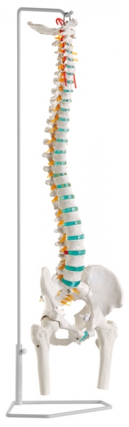Flexible lebensgroße Wirbelsäule. Sie besteht aus Os occipitale, Hals-, Brust- und Lendenwirbeln, Os sacrum, Os coccygis, vollständigem Becken mit Symphyse und abnehmbaren Femurköpfen. Ebenfalls dargestellt sind die Vertebralarterien, die Äste der Spinalnerven und eine Bandscheibe mit Prolaps in Höhe von L3-L4. Mit Stativ zum Aufhängen.