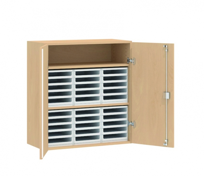 Formular-Aufsatzschrank, BxHxT 87 x 92 x 40 cm 2 Türen, abschließbar, Dreholive, 2 Einlegeböden 6 Kunststoff-Formulareinsätze ( Farbe: Grauweiss ) mit je 5 herausnehmbaren Schubkästen