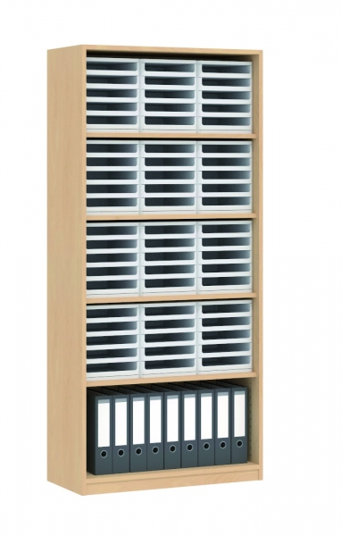 Formularschrank, BxHxT 87 x 190 x 40 cm offen, 4 Einlegeböden 12 Kunststoff-Formulareinsätze ( Farbe: Grauweiss ) mit je 5 herausnehmbaren Schubkästen