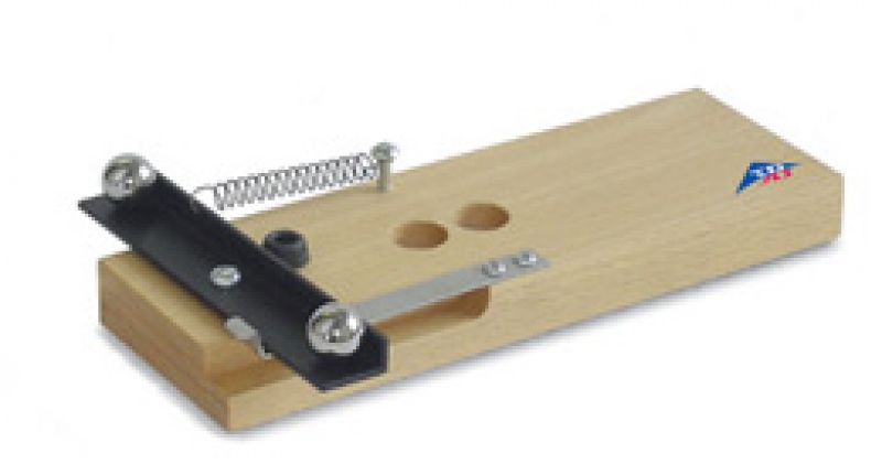 Auf einer Holzplatte befindet sich die Abwurfschiene, die mit einer Zugfeder gespannt wird.