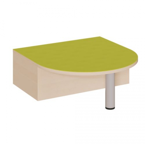 Unser kleines Podest mit Halbrundansatz im 35-cm-Radius ist eine schöne Ergänzung von Linoleumpodest-Kombinationen. Die auskragend wirkende Oberplatte steht durch die mittige kräftige Stahlstütze selbstverständlich vollkommen sicher; sie kann Aktionsebenen oder in Ruhebereichen andere Podestelemente ergänzen, wobei die geringen Grundmaße 75 x 70 cm einen variablen Einsatz ermöglichen. Der geschlossene Rechteckbereich hat die Außenmaße von 70 x 40 cm. Das Stahlrohr ist im Farbton RAL 9006 gepulvert. Die Linoleumoberfläche ist in vielen freundlichen Farben wählbar und besitzt eine strapazierbare und pflegeleichte Oberfläche, deren weitere Vorteile in Kratzfestigkeit, Desinfizierbarkeit und Geräuschdämmung zu sehen ist. Das Dekor der melaminbeschichteten Oberflächen ist passend zur Optik von anderen Möbeln im Raum wählbar. Die Anbindung zu anderen Podestelementen wird über zusätzliche Podestverbinder sicher gestellt.