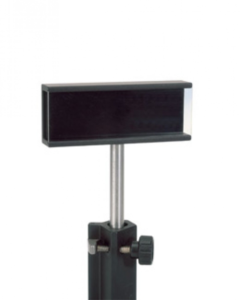 Zwei zueinander geneigte Oberflächenspiegel aus schwarzem Acrylglas in Halter aus schwarz eloxiertem Aluminium mit fest montiertem Spiegelschutz auf Edelstahl-Stativstab.