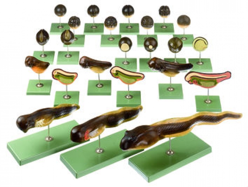 bestehend aus 23 Einzelmodellen, die die Entwicklung des befruchteten Froscheies bis zur Kaulquappe veranschaulichen. Neuanfertigung der Zieglerschen Serie nach Prof. Ecker. Vergrößerung ca. 50 : 1, Durchmesser des natürlichen Eies ca. 1,5 mm. A. Furchungsstadium (8 Modelle), B. Stadium der Keimblattbildung (4 Modelle), C. Bildung der Neuralrinne (2 Modelle), D. Kaulquappenbildung (6 Modelle), E. Schwimmende Quappen (3 Modelle). Jedes Modell einzeln auf Stativ und Sockel, unzerlegbar.