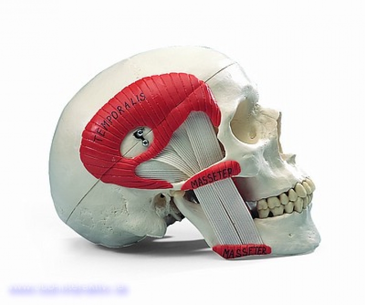 Mit diesem Modell können Sie die Funktion der Kaumuskulatur mit Kieferschluss, die Einleitung der Kieferöffnung sowie die Verschiebungen des Unterkiefers zur Seite und nach vorn demonstrieren. Die Schädeldecke ist abnehmbar.
