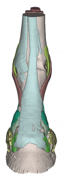 Dieses Modell eines Hengstfußes wurde abgeleitet aus CT- und MRT-Daten, ist anatomisch exakt und in Lebensgröße. Hergestellt im 3D-Druckverfahren in Farbe, ist jede anatomische Struktur in einer anderen Farbe dargestellt.