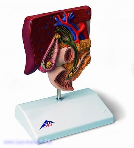 Dieses anschauliche Modell zur Patientenaufklärung zeigt die Anatomie des Gallensystems und seiner Umgebung in halber natürlicher Größe. An der Gallenblasenwand sind sowohl eine akute Entzündung (Cholecystitis) als auch die Gewebeveränderungen nach einer chronischen Entzündung sichtbar. Gallensteine sind an den folgenden typische Lokalisationen erkennbar: