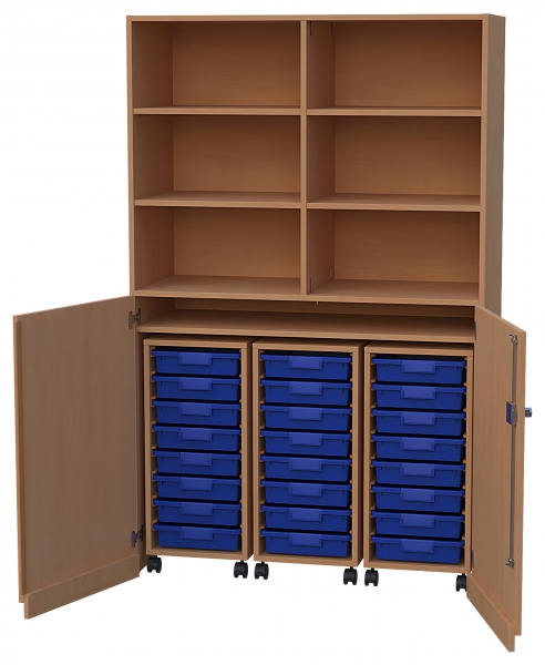 Garagenschrank, BxHxT 120 x 190 x 50 cm oben: offen, Mittelwand,2 x 2 verstellbare Einlegeböden 2 x 1 fester Fachboden unten: 2 Türen mit Schleppsockel, abschließbar, Dreholive,unten: 3 fahrbare Materialcontainermit je 8 flachen Kunststoffkästenauf Kunststoffschienen laufend