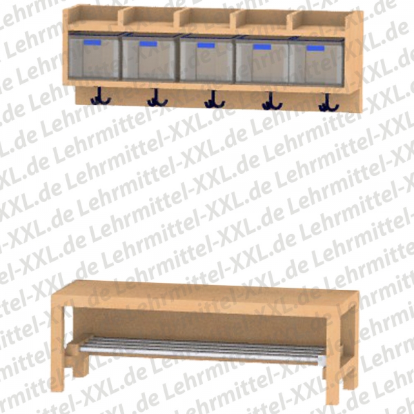 • Oberteil mit einem Dreifachhaken, einem offenen Fach mit Kunststoffbox und einer Ablagefläche pro Platz