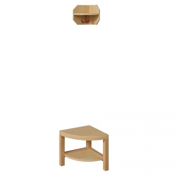Unsere zweiteiligen Außeneck-Garderobenelemente ergänzen stützenrahmenfreie Komplettgarderoben am offenen Ende vorteilhaft in passender Konstruktion. Sie bestehen ebenfalls aus Buche-Holzstollen. Die schräge Ablage hat über Eck stabile Seiten aus dicken Multiplex-Platten. Maße der Ablage B/H/T: 18x20x18 cm. Unter der Fachablage ist ein passender farbiger drehbarer Dreifachhaken montiert. Die gerundete Sitzfläche besteht aus stabiler melaminbeschichteter Spanplatte im Dekor Buche-hell. Unter dem Sitz befindet sich eine ebenfalls gerundete Schuhablage. Die gewünschte Anstellseite und die Sitzhöhe sind wählbar. Die Größe der Sitzfläche beträgt 35x35 cm.