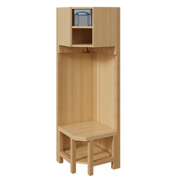 Unsere Inneneck-Garderobenelemente ergänzen die Komplettgarderoben vorteilhaft in passender Konstruktion. Sie bestehen ebenfalls aus Buche-Holzstollen. Die Garderobenstützen haben wandseitig eine Ausklinkung für Sockelleisten. Zwischen den Garderobenstützen sind flächig Paneelrückwände (mit wählbarem Dekor) montiert. Die Ablage über Eck ist als stabiler Korpus mit doppelten Fachablagen aus melaminbeschichteter Spanplatte verleimt, im oberen Fach steht eine Box mit Deckel, darunter steht ein 15 cm hohes Fach zur Verfügung. Maße der Ablage B/H/T: 43x46x43 cm. Unter der Fachablage ist der passende farbige drehbare Dreifachhaken montiert. Die Sitzfläche besteht aus stabiler melaminbeschichteter Spanplatte, das Dekor ist wählbar. Darunter befindet sich eine flächige Schuhablage. Die Garderoben sind 158 cm hoch, die gewünschte Sitzhöhe ist jedoch wählbar. Die Größe der Sitzfläche beträgt 43x43 cm.