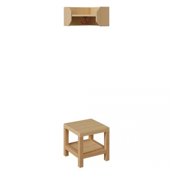 Unsere Inneneck-Garderobenelemente ergänzen die Komplettgarderoben vorteilhaft in passender Konstruktion. Sie bestehen ebenfalls aus Buche-Holzstollen. Die Ablage hat über Eck stabile Seiten aus dicken Multiplex-Platten, sie wird direkt an der Wand montiert. Maße der Ablage B/H/T: 35x20x35 cm. Unter der Fachablage ist der passende farbige drehbare Dreifachhaken montiert. Die Sitzfläche besteht aus stabiler melaminbeschichteter Spanplatte im Dekor Buche-hell. Unter dem Sitz befindet sich eine flächige Schuhablage. Die gewünschte Sitzhöhe ist wählbar. Die Größe der Sitzfläche beträgt 35x35 cm.