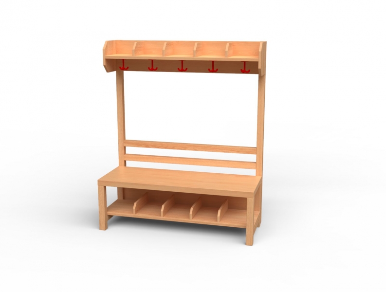 Garderoben-Set fĂŒr 5 PlĂ€tze BxHxT 100 x 130 x 35 cm Stollen-Garderobenbank mit offenen Seitenteilen- MIT Ablageplatte mit Facheinteilung ( Holz ) - MIT Garderoben-H-StĂŒze - MIT Garderobenablage 1-reihig mit 5 3-fach Kunststoffhaken