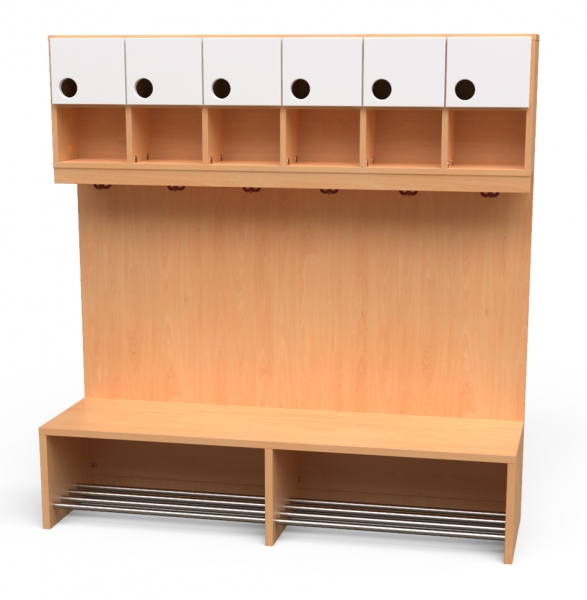 Garderoben-Set "modern line" 6 Plätze BxHxT 150,2 x 155 x 35 cm 1 x Korpus-Garderobenbank ( seitlich geschlossen ) mit Alurost Ablage als Schuhablage Sitzhöhe: 34 cm 1 x Garderoben-Paneel 1 x Garderobenablage, oben: je Fach 1 Tür mit Griffloch darunter je 1 offenes Fach mit je 1 untermontierten 3-fach Kunststoffhaken je Sitzplatz