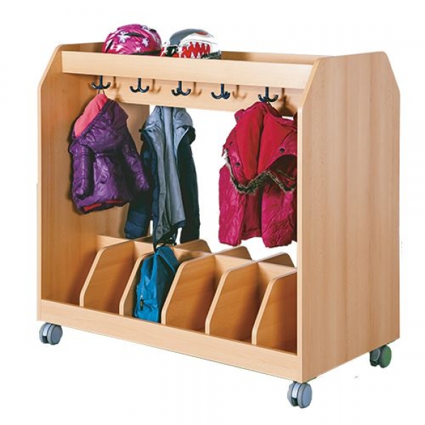 "Ordnung schaffen auf geringem Raum - und dabei noch mobil bleiben! 12 große Taschen, Ranzen u. ä. finden hier übersichtlich ihren Platz und darüber hängen die zugehörenden Jacken."