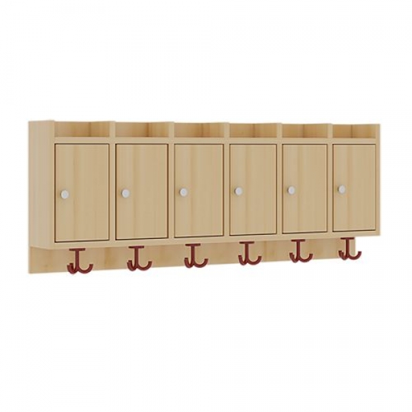 6 Fächer mit Türen, darunter 3fach-Haken, oben offene Unterteilungen, B/H/T: 120x46x27 cm, aus feuerhemmendem Material