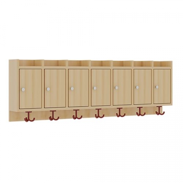 Die Ablagen aus melaminbeschichteter Spanplatte haben 34 cm hohe Fächer mit rechts hängenden Türen und darüber 5 cm hohe Ablagen, das Dekor ist wählbar. Unter der Fachablage sind in Anzahl der Plätze farbige drehbare Dreifachhaken montiert. Die Breite und damit die Anzahl der Plätze sind wählbar.