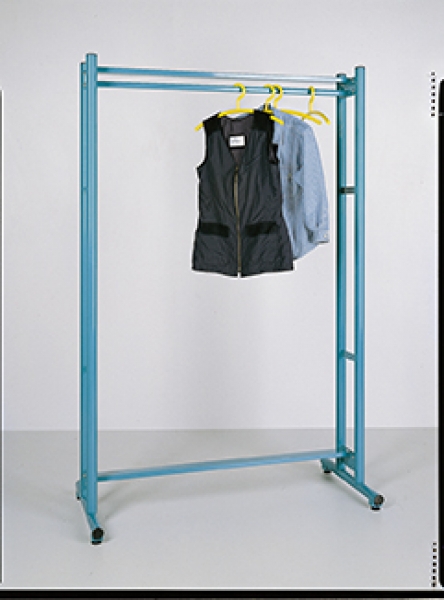Ideal in Bereichen, in denen wandbefestigte Garderoben nicht möglich ist. Garderobe aus Rundrohr, Durchmesser 40 cm, mit Gleitfüßen und Kleiderstange.