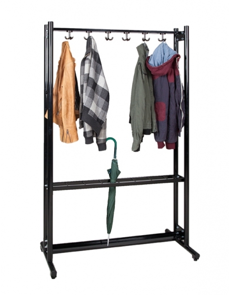 Ideal in Bereichen, in denen wandbefestigte Garderoben nicht möglich ist. Garderobe aus Rundrohr, Durchmesser 40 cm, mit Gleitfüße, Schirmhalter und Abtropfwanne.