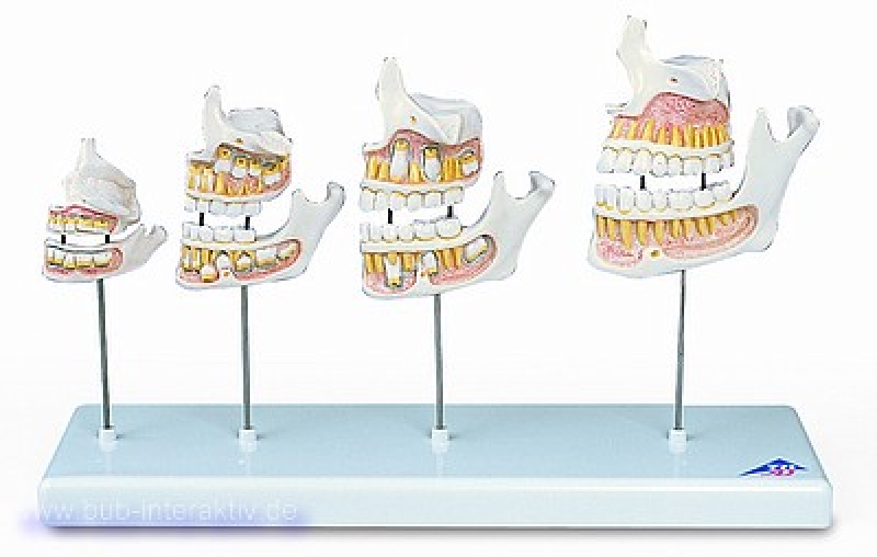 Modell der Stadien der Gebissentwicklung. Diese Naturabgüsse von 4 Ober- und Unterkieferhälften auf Stativ zeigen die besonderen Merkmale der verschiedenen Entwicklungsstadien:
