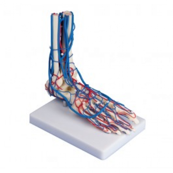Anschuungsmodell eines rechten Fußes in natürlicher Größe mit Darstellung aller wichtigen Venen und Arterien. Das Gefäßsystem ist sowohl auf der Fußober- als auch auf der Fußunterseite dargestellt. Der Fuß kann abgenommen und umgekehrt auf das Stativ aufgesteckt werden, um die Unterseite zu betrachten. Auf Stativ.