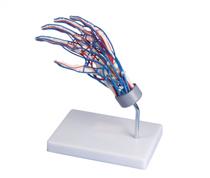 Anschauungsmodell der linken Hand in leicht geschlossener Position mit Darstellung aller wichtigen Venen und Arterien. Das Gefäßsystem ist sowohl auf der Handinnen- als auch auf der Handaußenfläche dargestellt. Die Hand kann gedreht werden, um das Modell einfach von beiden Seiten zu betrachten. Falls gewünscht ist die Hand auch vom Stativ abnehmbar.