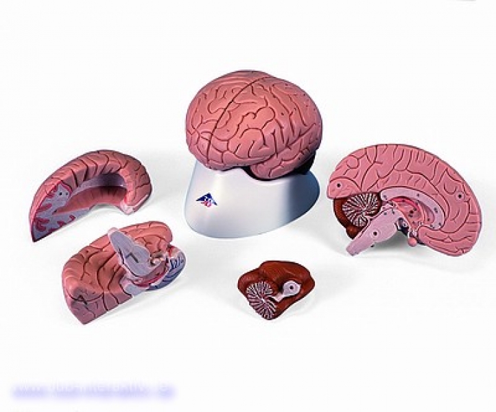 Alle Strukturen des median geschnittenen Gehirnes sind handbemalt, nummeriert und in einem Beiblatt benannt. Die rechte Hälfte ist zerlegbar in: