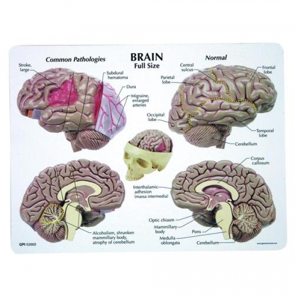 Das Gehirn, das in einem Teilschädel sitzt, weist die folgenden Pathologien auf, die auch auf einer zweiseitigen Bildungskarte veranschaulicht werden: