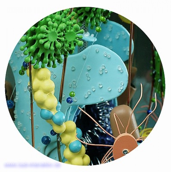 Alle wichtigen funktionstragenden Zellorganellen sind dargestellt. Ihre Anordnung im Modell hält einen Moment im dynamischen Gleichgewicht einer Zelle fest.