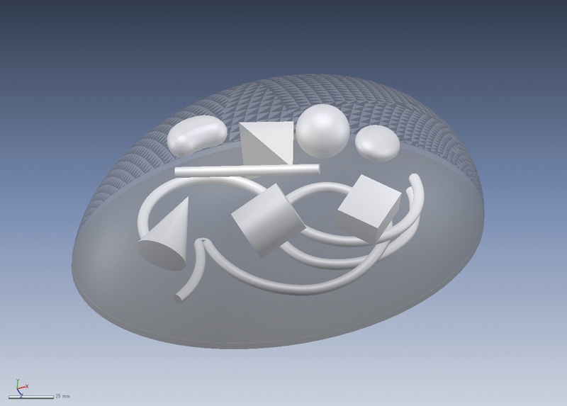 in eine Form eines 3D-Objekts zu interpretieren. In das Phantom sind 10 Objekte eingebettet. Lernen Sie, wie Sie den Tiefenausgleich anpassen, um eine geeignete Dichte zu erhalten, und wie Sie Abmessungen und Abstände messen. Objekte mit runden und flachen Oberflächen bieten eine Vielzahl von Schwierigkeitsniveaus.