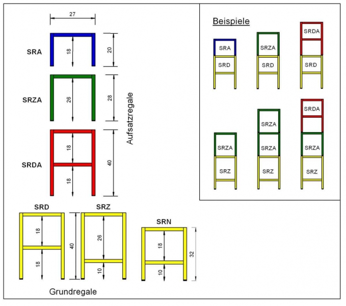 Grundregal mit Aufsatzregalen beliebig kombinierbar, Aufsatzregale mit Wandmontage-Set gegen Umkippen.