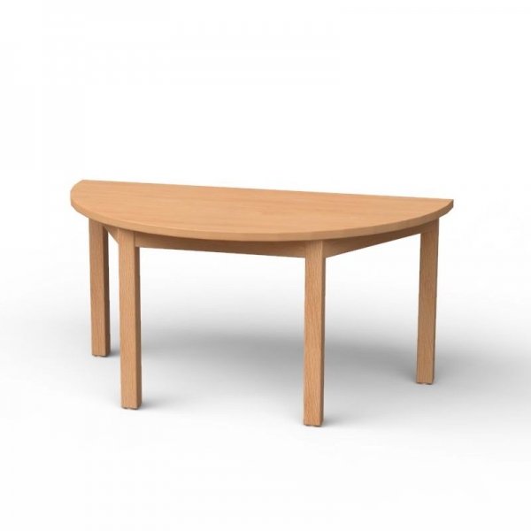 Halbrundtisch, Format: 120 x 60 cm Tischhöhe: bitte wählen40 / 46 / 52 / 58 / 64 / 70 / 76 cm 4-Fußgestell aus Quadratstollenmit gerader Zarge, Buche natur, lackiert Tischplatte: HPL Buche mit Buche Einleimer