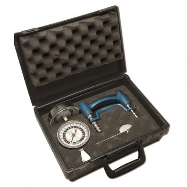 Das Set enthält ein hydraulisches Handdynamometer (Handkraftmesser) mit Druckmessuhranzeige (150kg), ein hydraulisches Fingerschlussmessgerät (50kg) mit Druckmessuhranzeige und ein Edelstahl-Fingergoniometer (Winkelmaß) mit 15cm Schenkellänge.