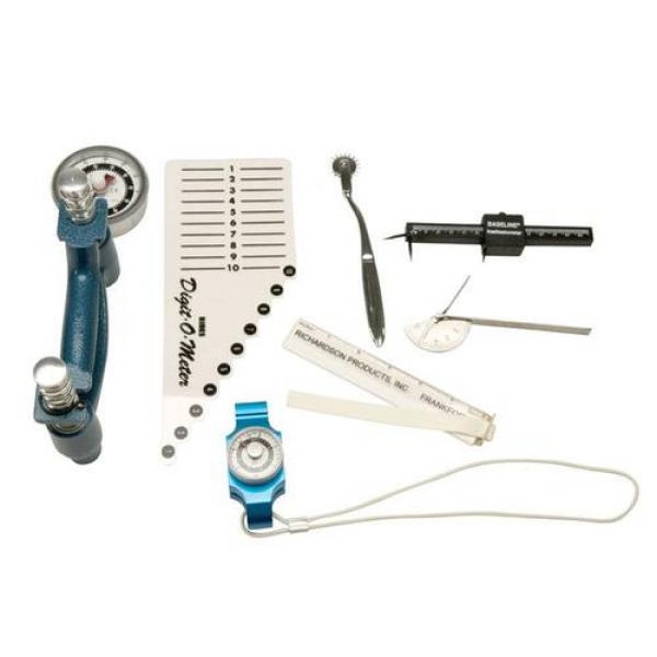 Darüber hinaus sind im Lieferumfang ein Zwei-Spitzen-Impulsunterscheider mit dritter Spitze für Hautsensibilitätstests, ein Nadelrad Wartenberg (Neurowheel), ein Fingerumfang-Messgerät und ein Fingerbeugungsmessgerät (Finger Flexion und Finger Daumen Gegenüberstellung) enthalten.