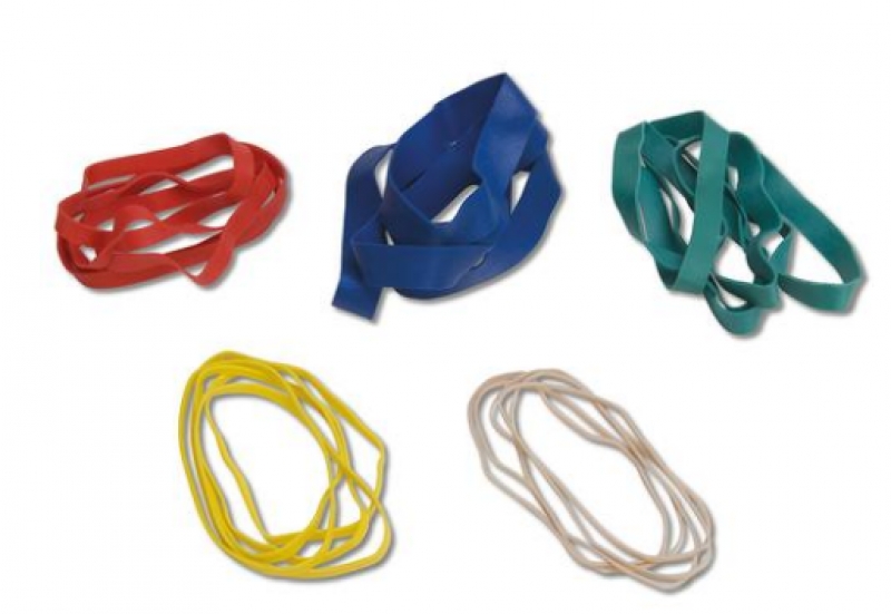 Set beinhaltet: 5 beige (sehr leicht xx), 5 gelbe (leicht x), 5 rote (leicht), 5 grüne (medium) und 5 blaue (stark) elastische Bänder ohne Latex.