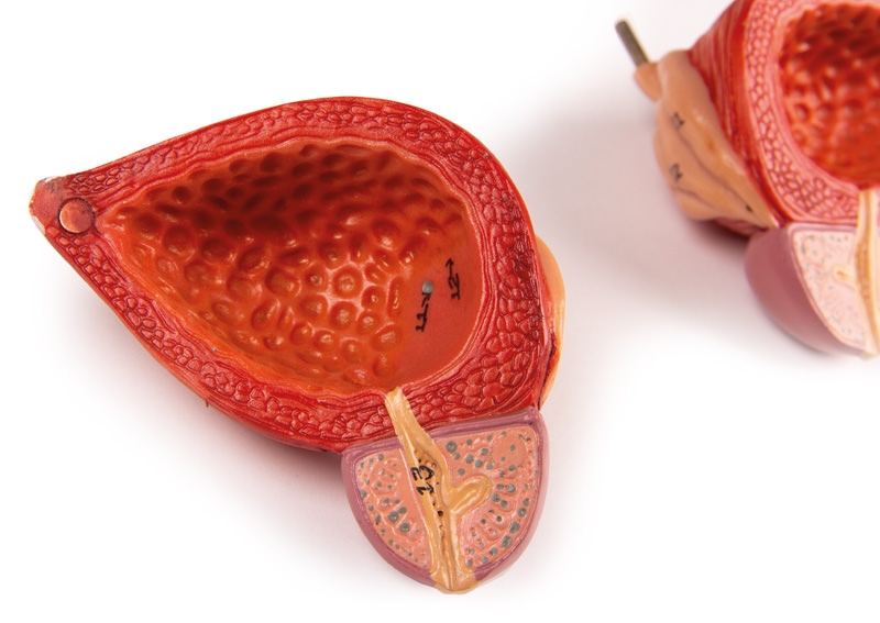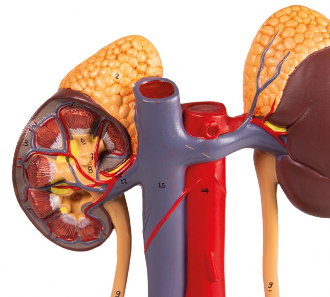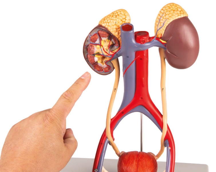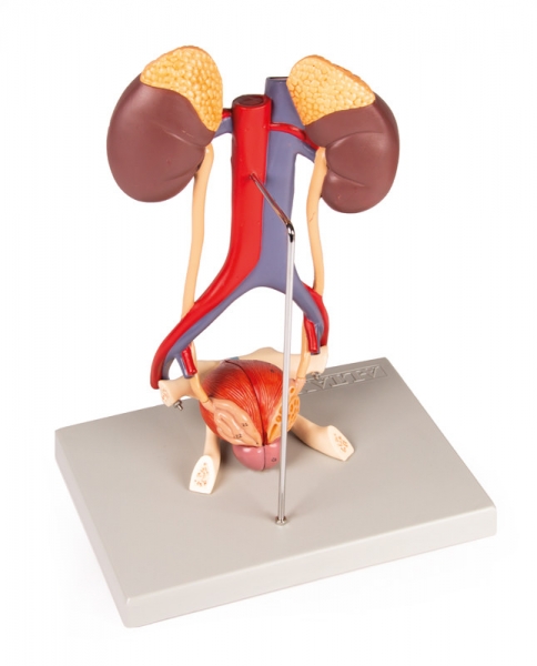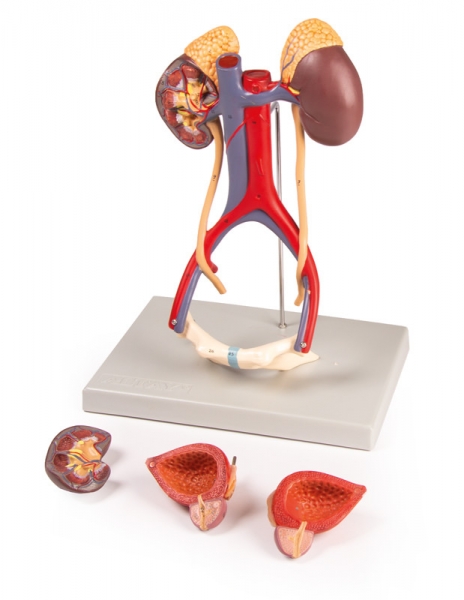 Dieses 5-teilige Modell in natürlicher Größe zeigt die wesentlichen Bestandteile des Harnapparats sowie die Vena Cava und Aorta abdominalis. Die rechte Niere ist eröffnet und zeigt die Nierenrinde, das Nierenmark, die Pyramiden, die Kelche, das Nierenbecken und die Ansätze der Nierengefäße. Die Blase kann geöffnet werden und zeigt Schleimhaut, das Blasendreieck, die Harnröhre, die Samenbläschen, den Ductus ejaculatorius und vas deferens. Auf Stativ.