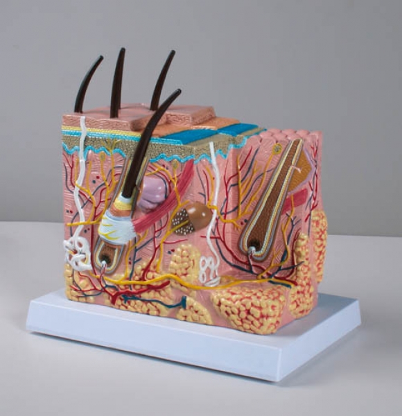 Neben Nerven und Blutgefäßen sind im Modell Schweißdrüsen, Talgdrüsen, Haarfollikel, Haarmuskeln, Vater-Pacinische Lamellenkörperchen und vieles mehr dargestellt.