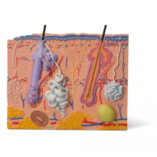 Dieses Anschauungsmodell besteht aus jeweils drei Einzelanteilen auf einem gemeinsamen Sockel, welche jeweils Anschnitte der menschlichen Haut in einer 80-fachen Vergrößerung repräsentieren. Anatomische Unterschiede der Hautanteile werden so didaktisch verständlich dargestellt.