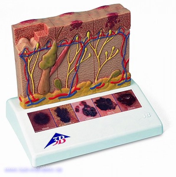 An den Seiten des Modells sind die unterschiedlichen Eindringtiefen in die Hautschichten nach Clark (I-V) und Breslow (in mm) gekennzeichnet. Auf dem Sockel zeigen 5 Originalabbildungen in Farbe verschiedene Ausprägungen des malignen Melanoms. Auf Sockel.