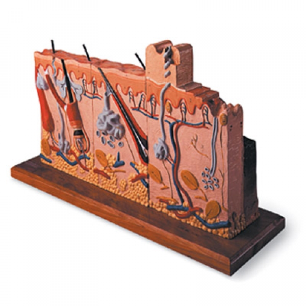 Die Vorderseite zeigt drei Reliefdarstellungen der gesunden Haut und ermöglicht den Vergleich von unbehaarter Haut, behaarter Körperhaut und Kopfhaut.