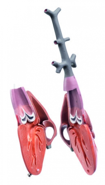 in zerlegbarer Ausführung, aus SOMSO-Plast®. Die innere Struktur wird in allen Einzelheiten gezeigt, die Strömungsbahnen des Blutes sind markiert. Insgesamt 7 Modelle, in natürlicher Größe und zum Teil vergrößert, einzeln auf Stativ mit grünem Sockel. 1. Knochenfisch (Hecht, Esox lucius), 2. Frosch (Rana esculenta), 3. Schildkröte (Emys orbicularis), 4. Krokodil (Crocodylus niloticus), 5. Steinadler (Aquila chrysaetos), 6. Hund und 7. Mensch. Insgesamt 14teilig.