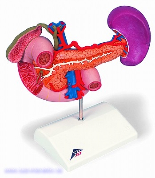 Das Modell zeigt den Zwölffingerdarm (teilweise eröffnet), Gallenblase und Gallenwege (eröffnet), die Bauchspeicheldrüse (große Ausführungsgänge freigelegt), die Milz und die umgebenden Gefäße in natürlicher Größe.