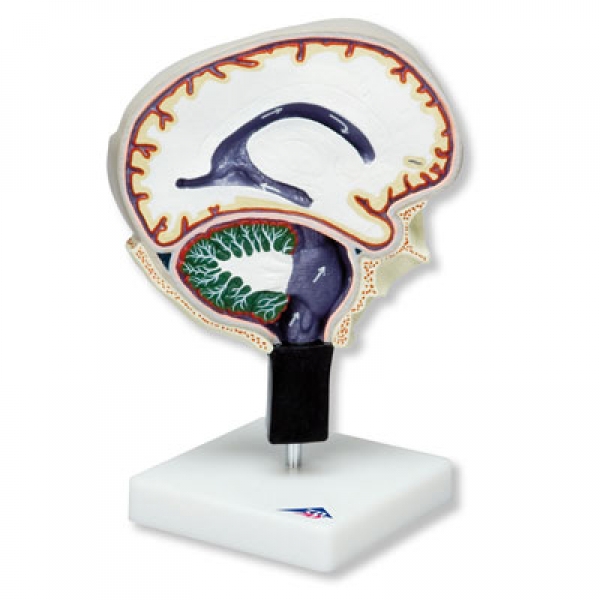 Vergrößertes, detailliertes Modell eines Schnitts durch die rechte Gehirnhälfte mit Schnittdarstellung der Pia mater, Spinnwebenhaut und Dura mater. Das Modell weist eine klare Kennzeichnung der Bereiche der Gehirn- und Rückenmarksflüssigkeit auf und die jeweilige Flussrichtung ist durch Pfeile markiert. Kräftige Farben zur Unterscheidung wichtiger Merkmale, auf Stativ. Mit Keycard in englischer Sprache.