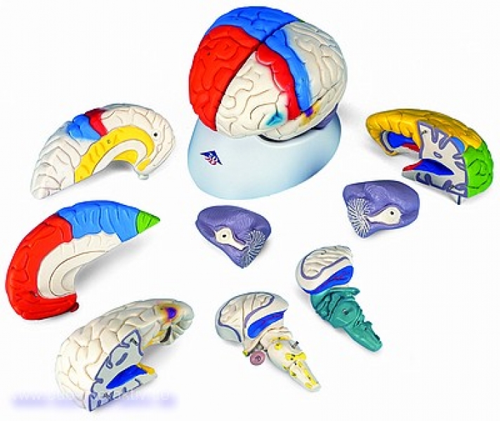 Median geschnitten, zeigt dieses Modell auf der rechten Hälfte die farblich differenzierten Repräsentationsfelder der Großhirnrinde. Die linke Hälfte zeigt, ebenfalls farblich differenziert: