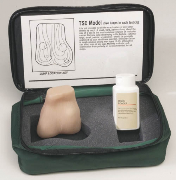 Dieses aus weichem Material gefertigte Modell in natürlicher Größe weist in jedem Hoden zwei Knoten auf. Ideal zum Lehren der Selbstuntersuchung der Hoden. Lieferung mit Transporttasche.