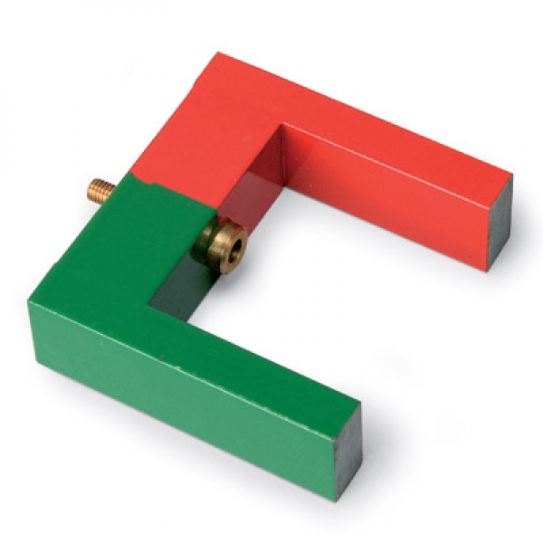 AlNiCo-Magnet in Hufeisenform. Mit Schraube. Pole rot/grün gekennzeichnet.
