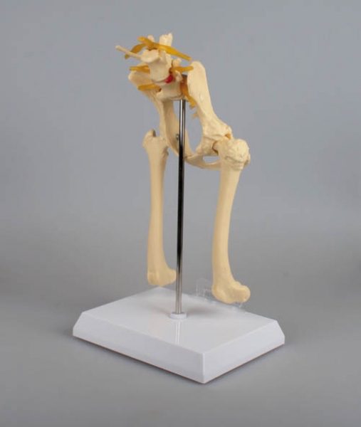 Hüfte eines Hundes mittlerer Größe mit sowohl gesundem als auch arthrotisch verändertem Knochen, Corpus ilii, Trochanter major, Femurkopf im Acetabulum, Diskushernie, Oberschenkelhals, Nerv, Sacrum und Trochanter tertius.